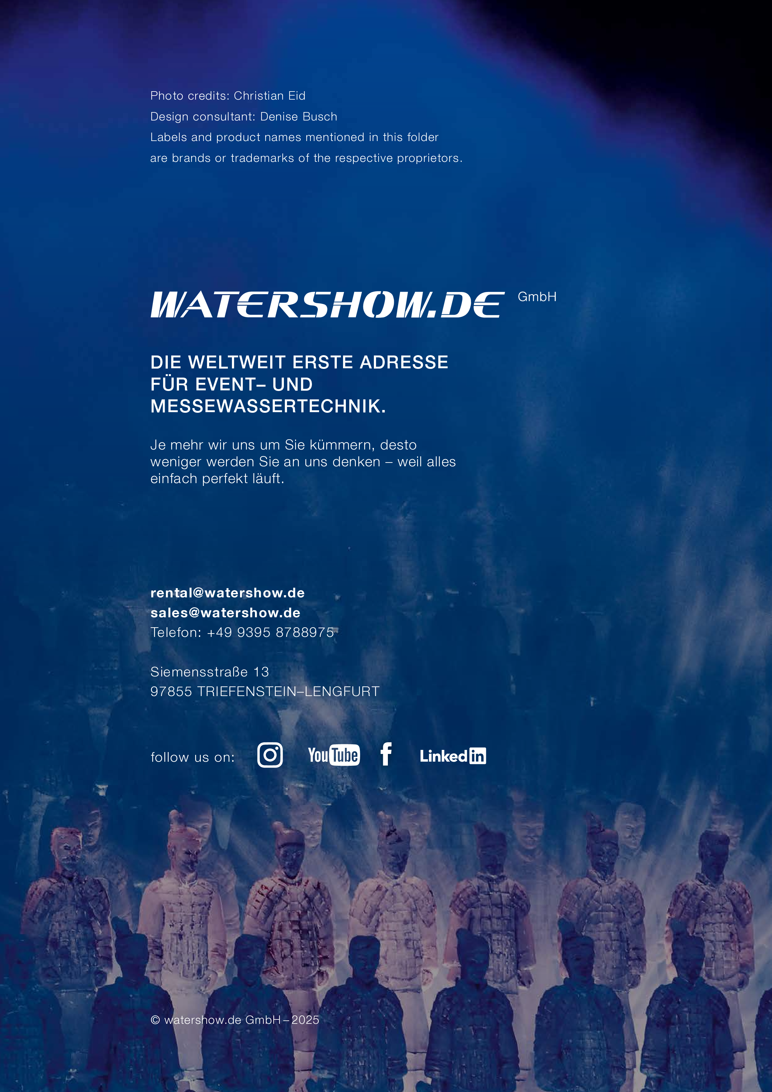 Watershow.de GmbH verwandelt Wasser in unvergessliche Erlebnisse. Von funkelnden Fontänen und eleganten Wasserwänden bis hin zu hochmodernen Wasserscreens, die Logos und Bilder mit fallenden Tropfen schreiben. Jede Show ist ein einzigartiges Highlight. Mit individuellen Lösungen, perfekter Technik und beeindruckender visueller Wirkung lässt Watershow.de Marken erstrahlen und Events unvergesslich werden.